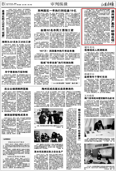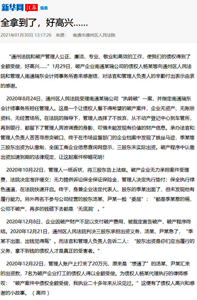 江蘇法制報(bào)截圖 近日“南通瑞東會計(jì)師事務(wù)所”的名字,不斷出現(xiàn)在《新華網(wǎng)》《江蘇法制報(bào)》的報(bào)道之中。一個小會所名字出現(xiàn)到主流新聞媒體中,實(shí)屬罕見。這要從我所承辦的一起破產(chǎn)案件說起。 2020年8月24日,通州區(qū)人民法院受理南通某瑞公司“執(zhí)轉(zhuǎn)破”一案,并指定南通瑞東會計(jì)師事務(wù)所擔(dān)任管理人。這是一個典型的企業(yè)無資產(chǎn)、無賬冊資料、無經(jīng)營場所的三無企業(yè),債權(quán)人看不到任何受償希望的破產(chǎn)案件。 南通瑞東會計(jì)師事務(wù)所由多名專業(yè)人員組成的清算組,主任會計(jì)師吳林海親自帶隊(duì)。在承辦法院的指導(dǎo)下,管理人從不動產(chǎn)登記中心到車管所,再到銀行,四處奔波,全方位開展資產(chǎn)調(diào)查工作,可惜仍未能發(fā)現(xiàn)有價(jià)值的財(cái)產(chǎn)信息。管理人團(tuán)隊(duì)苦苦尋思突破口,仔細(xì)尋找蛛絲馬跡,終于在稅務(wù)局申報(bào)表和市場監(jiān)督部門的企業(yè)檔案中發(fā)現(xiàn)了有益線索。原來債務(wù)人公司季某等三股東出資為認(rèn)繳制,全國工商企業(yè)信息查詢網(wǎng)顯示,三股東均未實(shí)際出資。根據(jù)企業(yè)進(jìn)入破產(chǎn)程序股東認(rèn)繳出資加速到期的法律規(guī)定,讓這起案件柳暗花明! 2020年10月22日,管理人一紙?jiān)V狀,將三股東告上法庭在申請?jiān)V訟保全后,債務(wù)人企業(yè)無力提供訴訟保全保證保險(xiǎn)金的情況下管理人毅然決然決定有管理人機(jī)構(gòu)自己先行墊付,申請法院進(jìn)行了保全保全。終于,身兼企業(yè)法定代表人、股東的季某出面了,但未發(fā)現(xiàn)他有履行能力。另外兩名不參與公司經(jīng)營的股東湯某、尹某一臉“委屈”:“都是季某惹的禍,公司不破產(chǎn),再多的錢砸下去都是‘無底洞’。但是法律是公正的,2020年12月21日,通州區(qū)人民法院判決三股東必須承擔(dān)出資義務(wù)。管理人負(fù)責(zé)人告知被告“股東出資是你們應(yīng)當(dāng)履行的義務(wù),拿不到錢的債權(quán)人才是真正的受害者。”迫于法律的威力,2020年12月22日,“想通了”的湯某、尹某向管理人賬戶打來了20萬元,最終, 7名打工人員全額拿回血汗錢! “破產(chǎn)管理人專業(yè)、敬業(yè)和高效的工作,使我們的債權(quán)得到了全額受償,好高興……”1月29日,破產(chǎn)企業(yè)南通某瑞公司的債權(quán)人楊某等向管理人南通瑞東會計(jì)師事務(wù)所寄來感謝信,對管理人的辛勤付出表示由衷的感謝。 為債權(quán)人楊某代理執(zhí)行的律師感嘆:“破產(chǎn)案件中債權(quán)全額受償,我執(zhí)業(yè)二十多年來從沒見過。” 盡職、盡力、盡心、盡我所能,維護(hù)債權(quán)人的利益、維護(hù)法律的權(quán)威這是南通瑞東會計(jì)師事務(wù)所作為破產(chǎn)管理人一貫堅(jiān)持的基本原則。所承辦案件得到債權(quán)人的認(rèn)可,得到法院的肯定,這是管理人的最大榮譽(yù)。 |